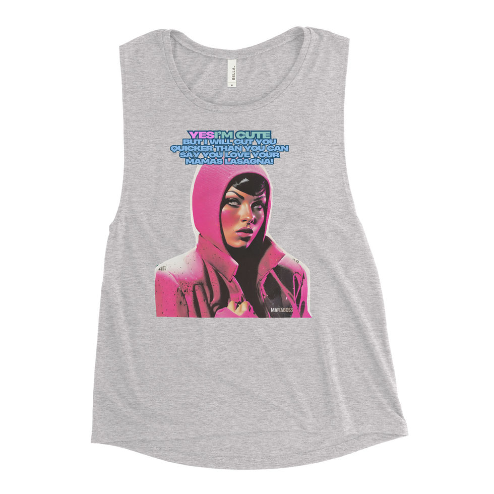 This comfortable muscle tank is soft and flowy with low cut armholes for a relaxed look.